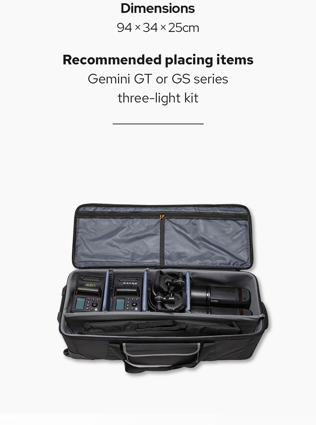 CB-06 Hard Carrying Case with Wheels dari Godox boleh menampung kit tiga lampu dengan aksesori, menjadikannya ideal untuk peralatan siri Gemini GT dan GS. Ia mempunyai reka bentuk yang serupa dengan beg perjalanan, dengan roda inline skate dan pemegang atas yang membolehkan anda menggulung beg dengan mudah di permukaan yang licin. Untuk jarak pendek, tali di setiap sisi beg boleh disambungkan melalui pemegang yang boleh ditanggalkan untuk dibawa dengan tangan dengan mudah.