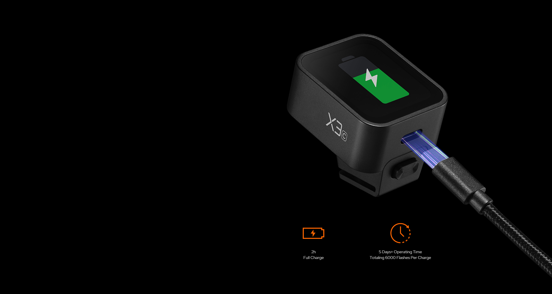 Equipped with a built-in rechargeable lithium battery, X3 offers hassle-free power on the go. With the USB-C port, the X3 swiftly charges from 0% to 100% in just 2 hours, ensuring you’re always ready to capture the moment. The standby time is around 7 days. Working 8 hours a day/triggering 1200 times per day, it can work for 5 days plus a bit, totaling 6600 flashes. 1 flash every 3 seconds, it can go up to 10000 flashes.